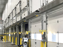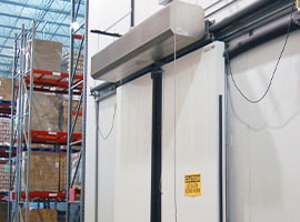 If you're familiar with cold storage applications (freezers and coolers), you're also familiar with the hazards that can be present around these doors. In cold storage, where forklifts are continually moving between sub-zero freezers to coolers and rooms at ambient temperatures, there is the potential for ice, fog and moisture to accumulate. As the ice gets thicker, so will the fog and moisture, which can compromise worker safety and door performance. Air curtains placed above these doors are ideal. They prevent the conditioned freezer air from escaping while blocking the outside air from entering. Reduced ice, fog and moisture means increased visibility, better performance and improved overall safety.