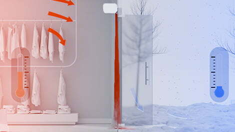 A core function of an air curtain is its ability to separate temperatures/separate environments. Whether you're blocking frigid winter winds from entering through a customer entrance door or separating two interior rooms, air curtains create an invisible barrier to prevent the mixing of one environment with another. In Cold Storage applications, the mixing of refrigerated air with ambient air can create safety hazards such as ice, fog and moisture buildup. Air curtains help prevent this while lessening the strain on the unit's cooling refrigeration.