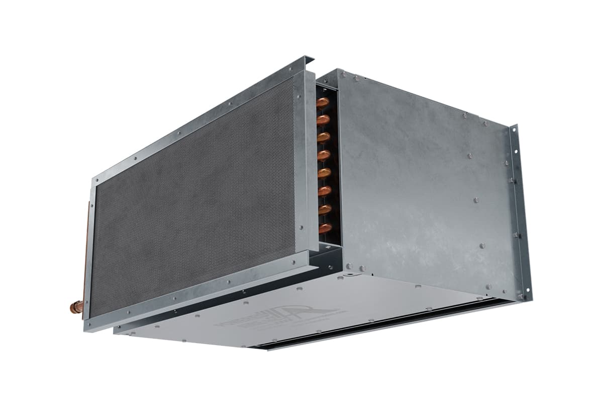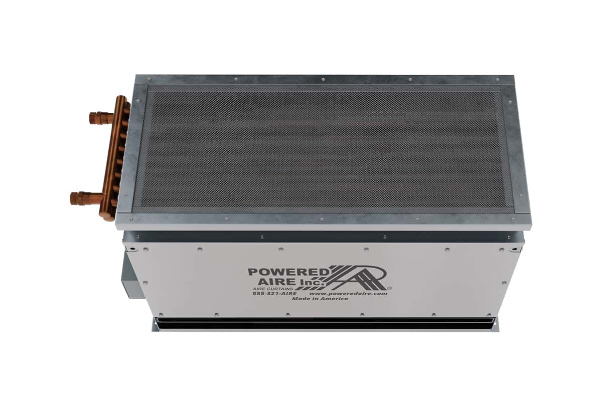 - Hot water coil comprised of galvanized steel casing, 5/8" copper tube, aluminum fins, and same end supply/return connections