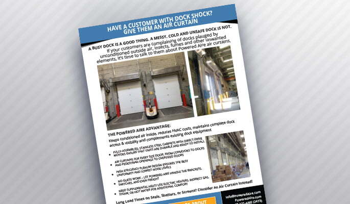 If your customers are complaining of docks plauged by unconditioned outside air, insects, fumes and other unwanted elements, it’s time to talk to them about Powered Aire air curtains. Learn more in our brochure.