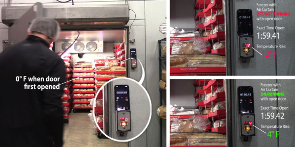 It is easy to talk about the benefits of Air Curtains in cold storage. It’s even better when you can see it in action. Powered Aire recently installed an unheated air curtain on a freezer door that struggled with fog and temperature loss each time product was moved in and out. Without the air curtain running, the temperature inside the freezer shot up from 0° to 12° in a two-minute-span. During that same time period, with the air curtain running, the temperature only rose four degrees.