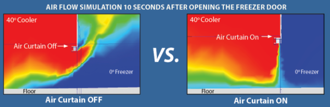 In the thermal image above, it’s easy to see the near instant infiltration of air when a freezer door is opened. The warm ambient air (as hot air does) rises and enters atop the wave of cold air as it spills out below. It’s a perfect storm for moisture that shows itself via ice, fog, and condensation buildup. With the door open and Air Curtain running, the warm air attempting to enter the top half of the freezer is entrained in a stream of air. It is then driven downward and away from the opening, thus reducing the amount of warm air entering the freezer.