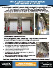 If your customers are complaining of docks plauged by unconditioned outside air, insects, fumes and other unwanted elements, it’s time to talk to them about Powered Aire air curtains. Learn more in our brochure.