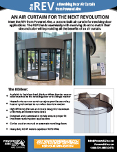 Meet the REV from Powered Aire, a custom-built air curtain for revolving door applications. The REV blends seamlessly with revolving doors to match their size and color while providing all the benefits of an air curtain.